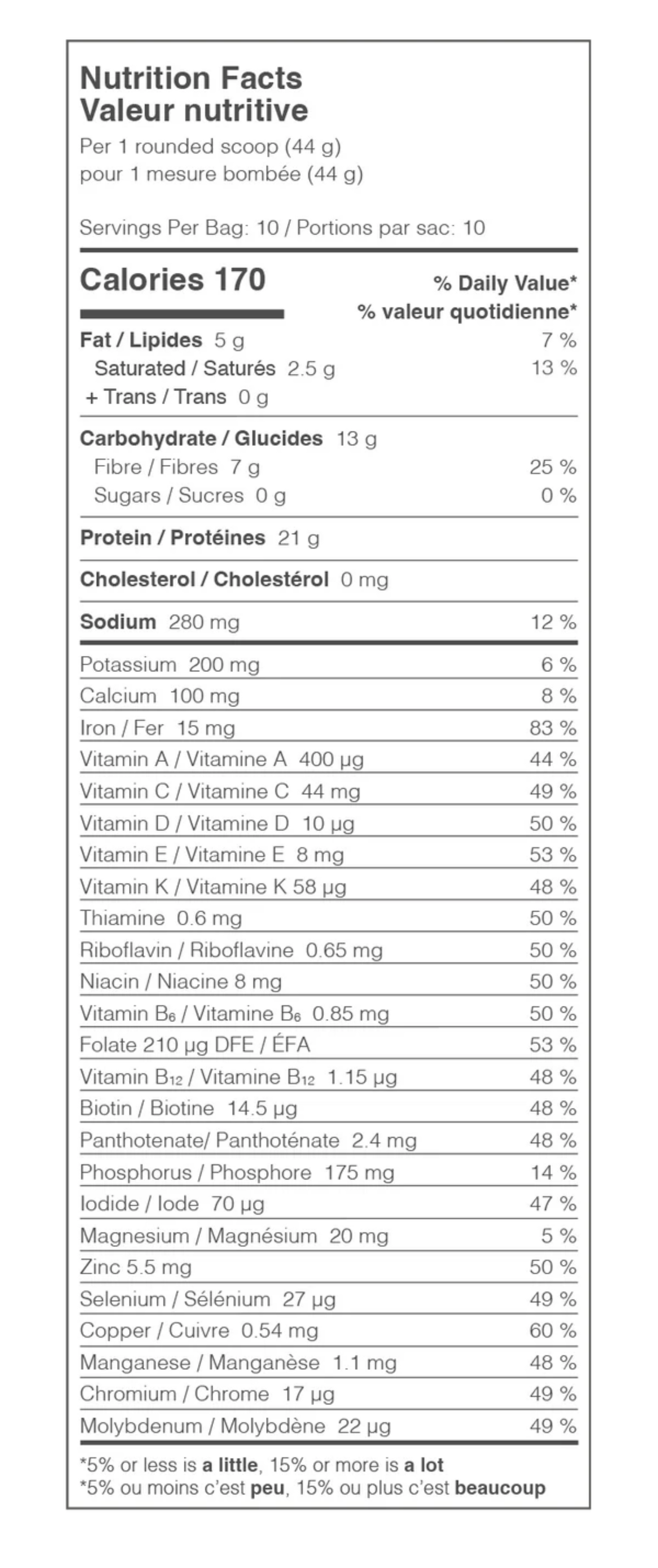 Protein blend (pea protein, milled golden flaxseed), Natural flavours, Soluble tapioca fibers, Coconut milk powder* (coconut milk powder*, tapioca maltodextrin*, acacia gum*), Alkalyzed cocoa powder, Acacia gum, Guar gum, Xanthan gum, Medium chain triglycerides (medium chain triglycerides from coconut oil, acacia gum), Fruits, vegetables and mushrooms blend (broccoli, spinach, kale, pumpkin, sweet potato, sunflower seed, cranberry, chlorella, maitake mushroom, shiitake mushroom, pomegranate juice powder*, acai juice powder*, goji juice powder*, grape juice powder*, amla fruit powder*, aronia powder*, sea buckthorn juice powder*, camu camu powder*, acerola juice powder*), Rebaudioside M, Salt, Bacterial culture and enzymes blend (rice maltodextrin, Bacillus subtilis, amylase, protease). *Organic ingredients