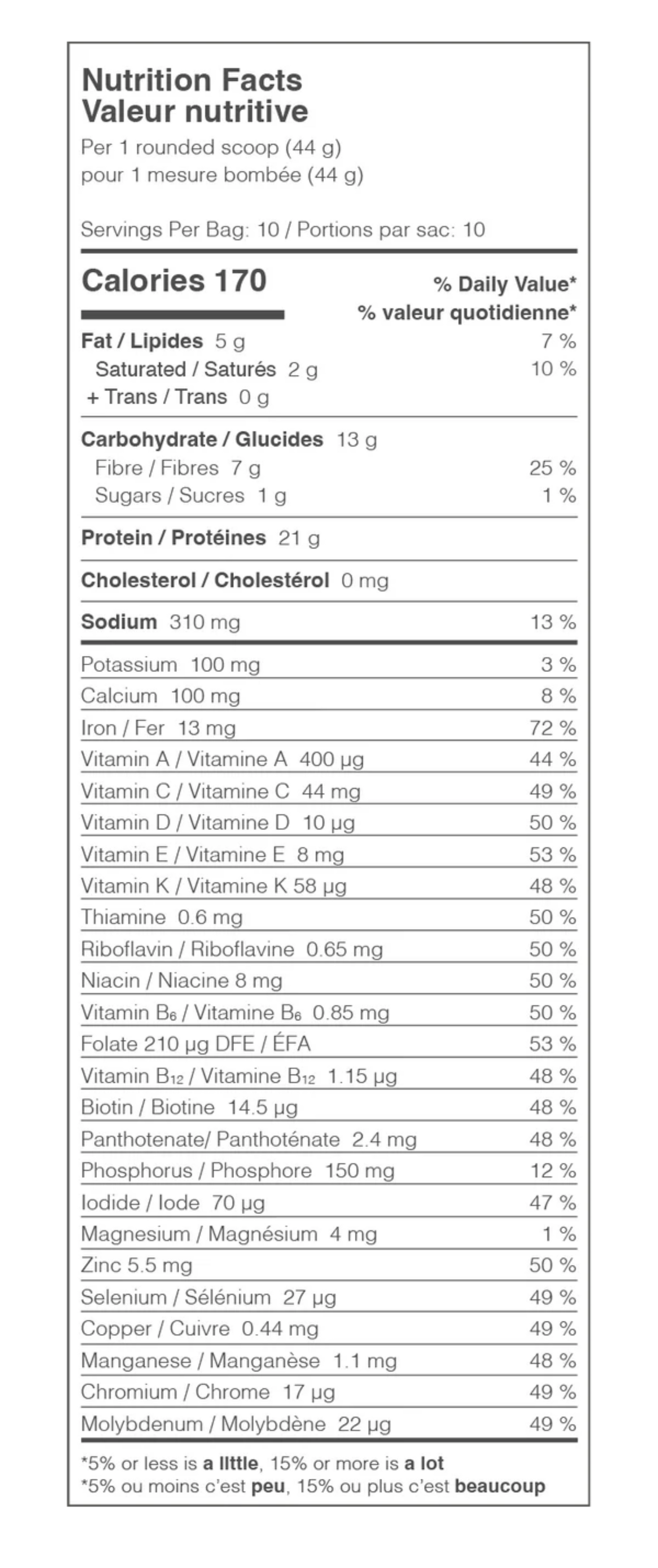 Protein blend (pea protein, milled golden flaxseed), natural flavours, soluble tapioca fibers, peanut flour, coconut milk powder* (coconut milk powder*, tapioca maltodextrin*, acacia gum*), acacia gum, guar gum, xanthan gum, medium chain triglycerides (medium chain triglycerides from coconut oil, acacia gum), salt, fruits, vegetables, and mushrooms blend (broccoli, spinach, kale, pumpkin, sweet potato, sunflower seed, cranberry, chlorella, maitake mushroom, shiitake mushroom, pomegranate juice powder*, acai juice powder*, goji juice powder*, grape juice powder*, amla fruit powder*, aronia powder*, sea buckthorn juice powder*, camu camu powder*, acerola juice powder*), rebaudioside M, and bacterial culture and enzymes blend (rice maltodextrin, Bacillus subtilis, amylase, protease). *Organic ingredients.