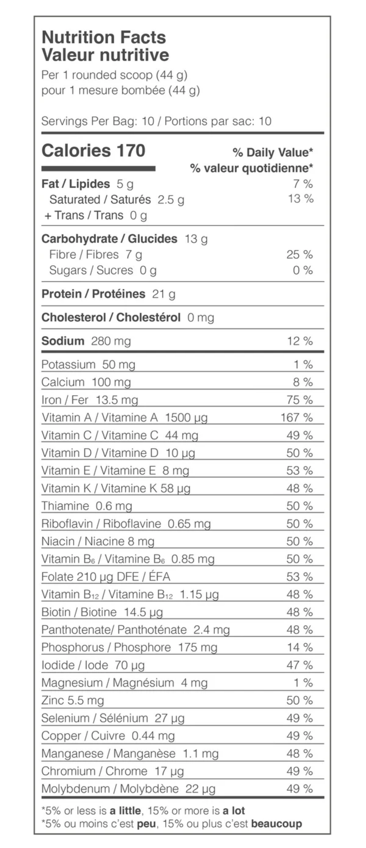 Protein blend (pea protein, milled golden flaxseed), Natural flavours, Soluble tapioca fibers, Coconut milk powder* (coconut milk powder*, tapioca maltodextrin*, acacia gum*), Acacia gum, Guar gum, Xanthan gum, Medium chain triglycerides (medium chain triglycerides from coconut oil, acacia gum), Rebaudioside M, Fruits, vegetables and mushrooms blend (broccoli, spinach, kale, pumpkin, sweet potato, sunflower seed, cranberry, chlorella, maitake mushroom, shiitake mushroom, pomegranate juice powder*, acai juice powder*, goji juice powder*, grape juice powder*, amla fruit powder*, aronia powder*, sea buckthorn juice powder*, camu camu powder*, acerola juice powder*), Beta-carotene, Salt, Citric acid, Bacterial culture and enzymes blend (rice maltodextrin, Bacillus subtilis, amylase, protease). *Organic ingredients